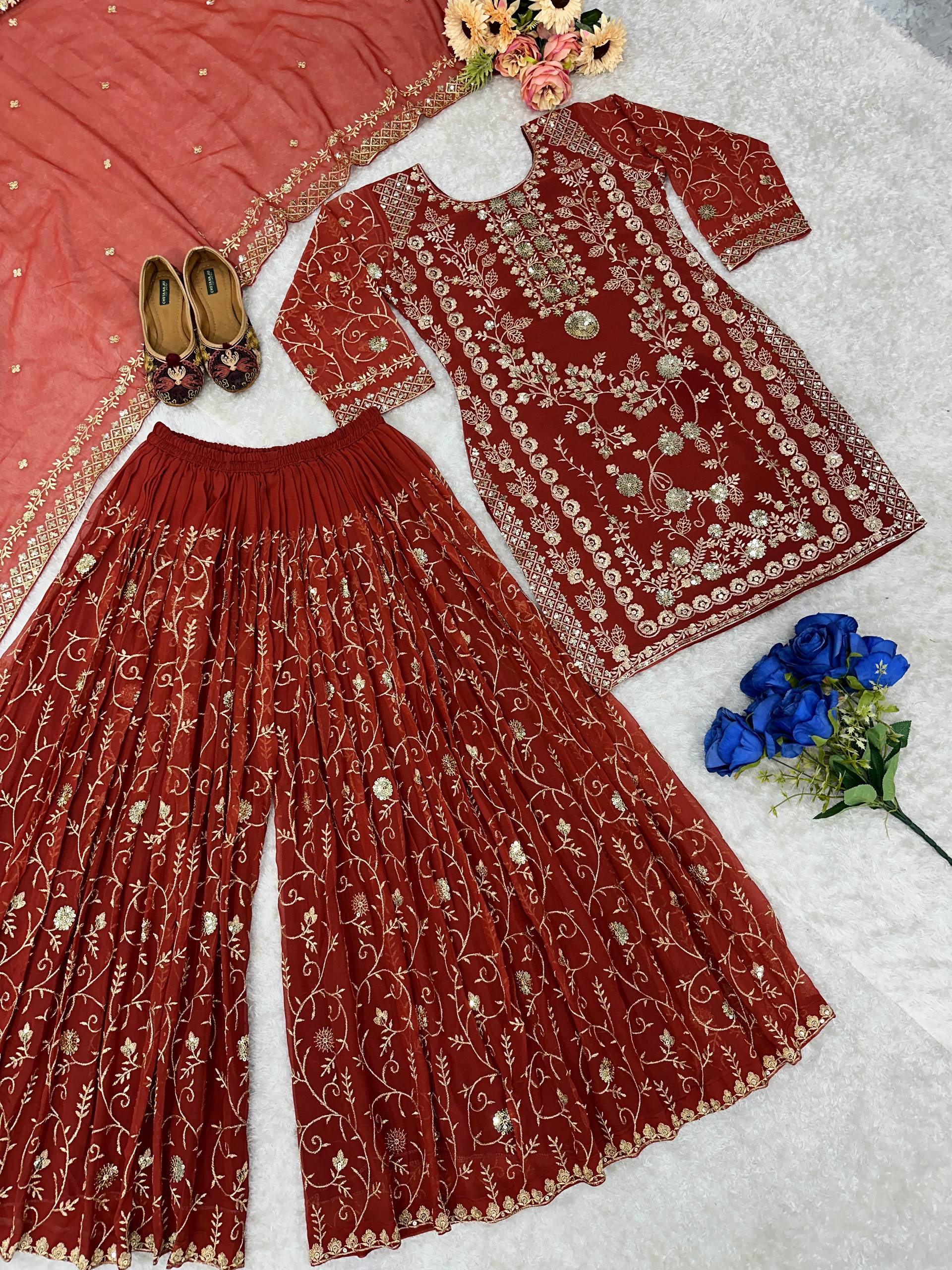 ĐĚSIGNER PARTY WEAR TOP AND PLAZZO. WITH FANCY DUPPATA AND EMBROIDERY WORK