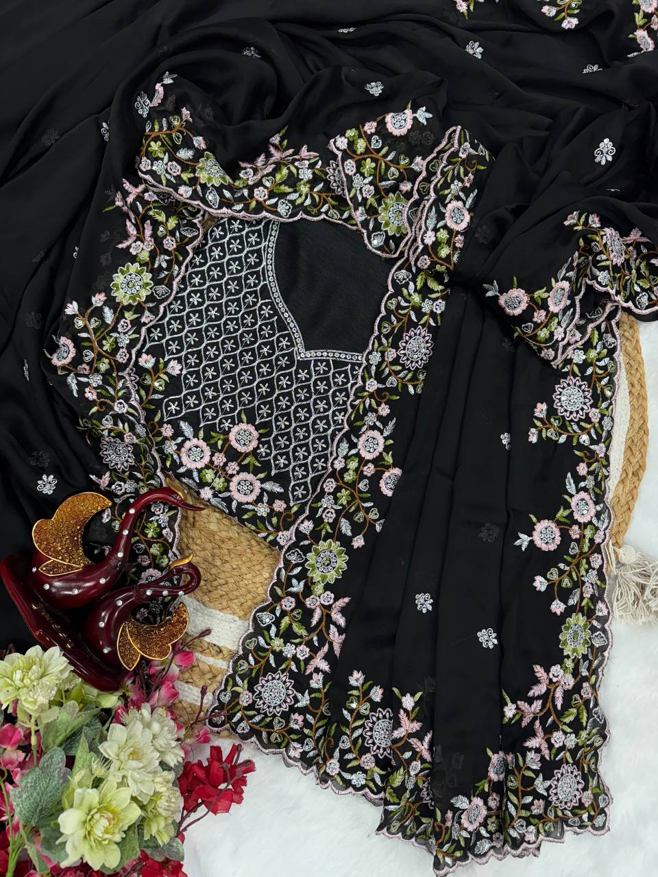 *BLOUSE :* Sequins and thread embroidery work in Heavy Mono Banglori (UNSTITCHED )