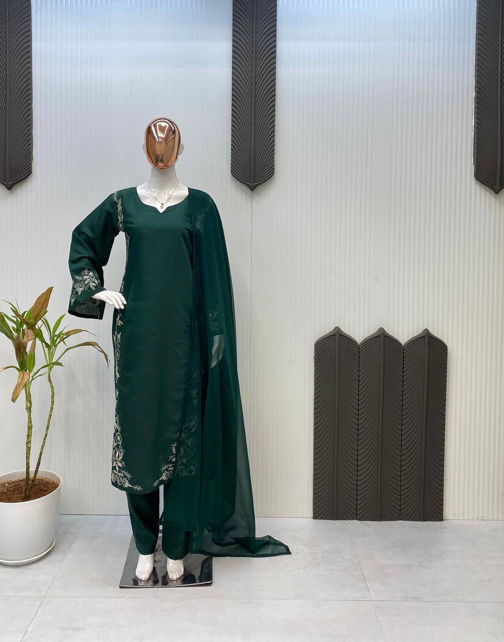 DESIGNER WEAR EXCLUSIVE SUIT IN ROMAN SILK FABRIC TOP AND PANT WITH GEORGETTE DUPATTA