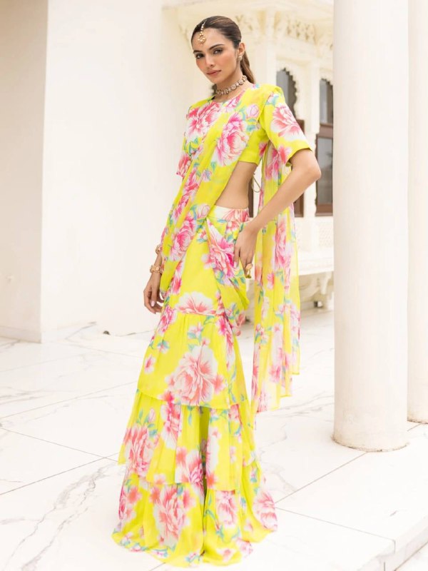 Elevate your festive and special occasion look with this stunning Georgette Ruffle Ready To Wear Saree With Readymade Blouse Design Launch known for its lightweight feel and graceful drape single available wholesale
