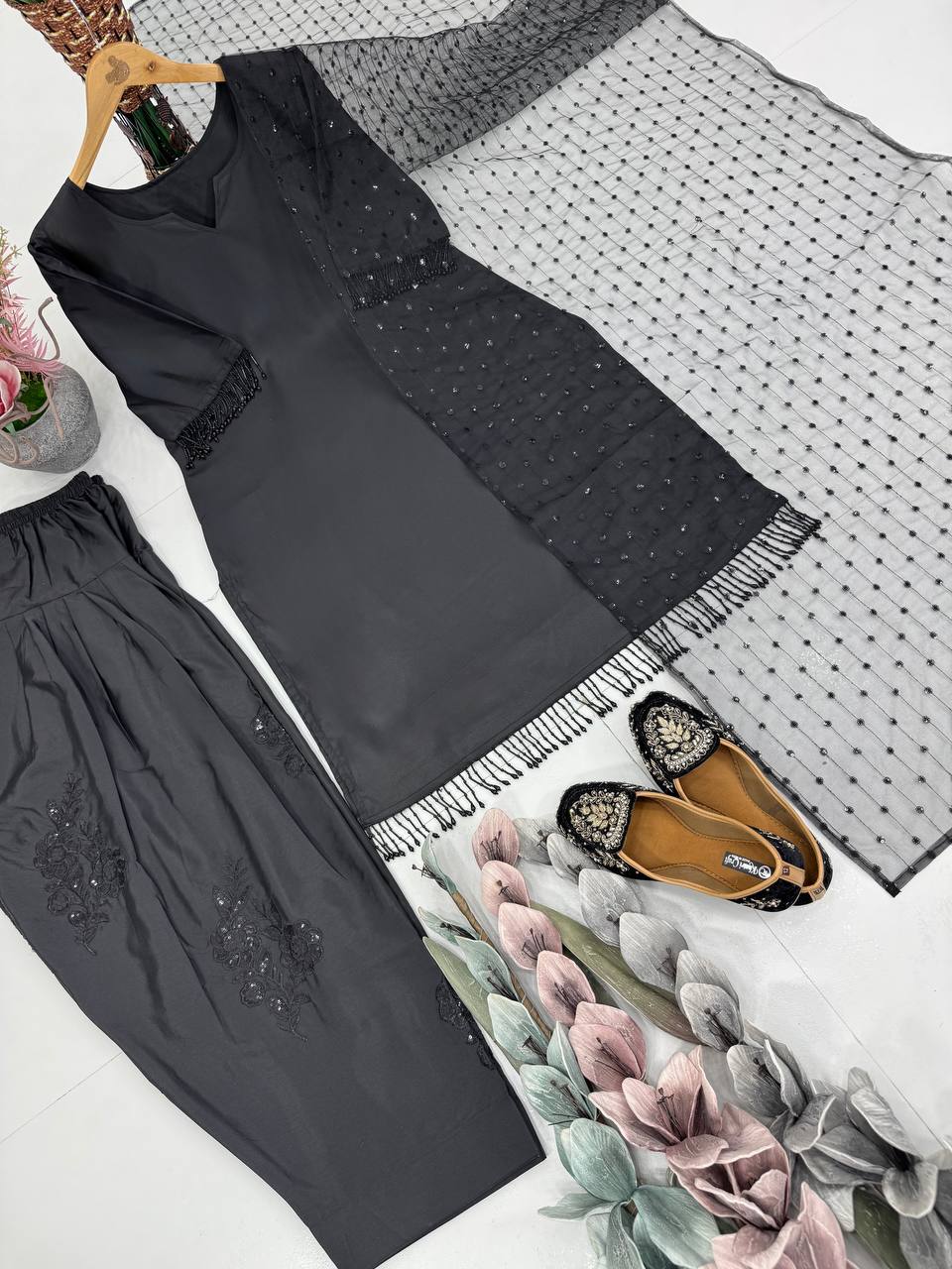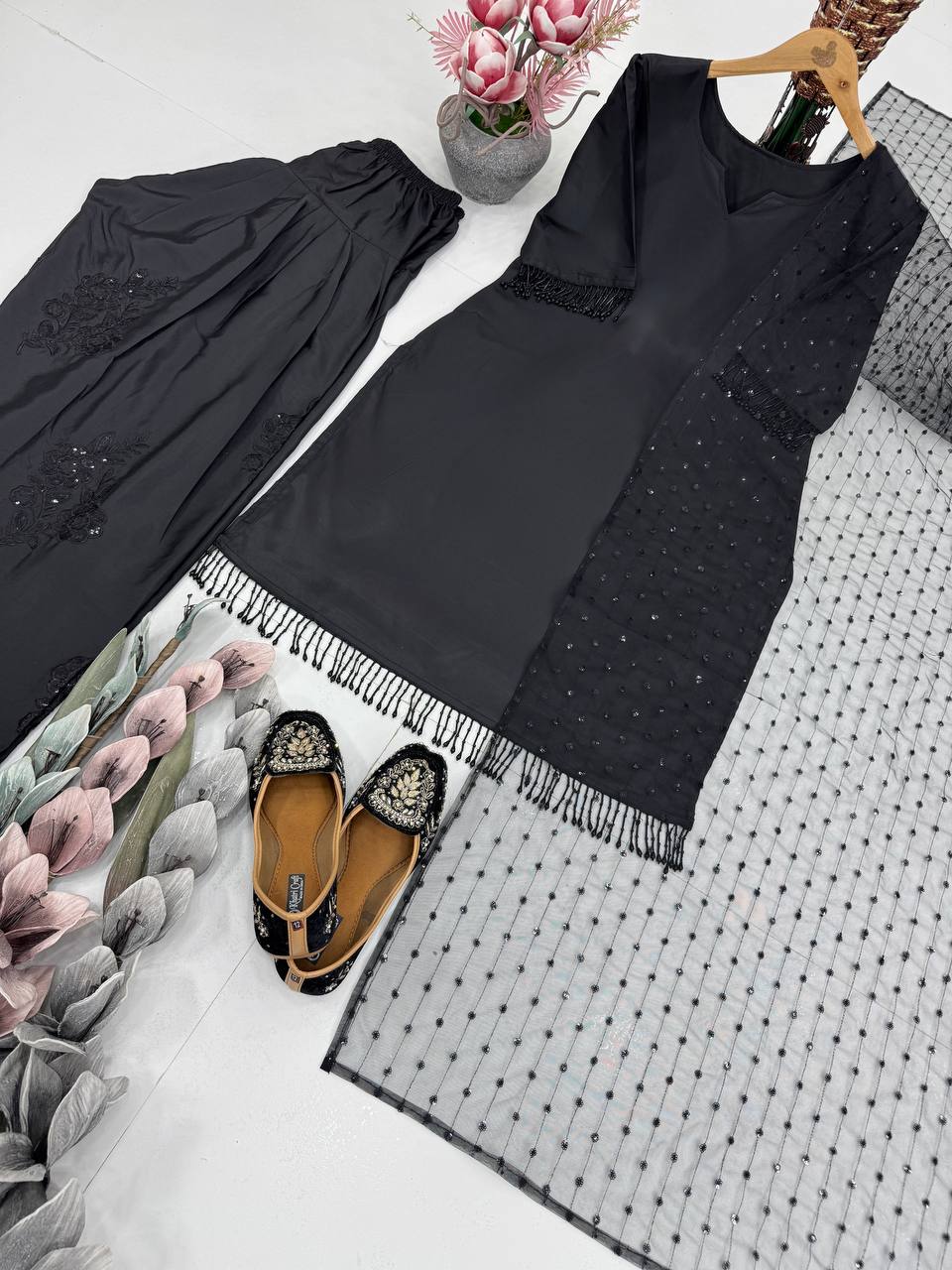 HEAVY NATURAL SILK EMBROIDERED SEQUENCE WORK WITH FANCY TOP-PENT DUPATTA SET