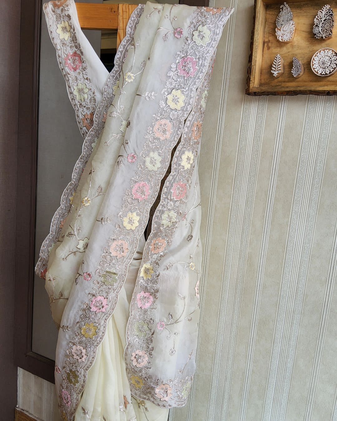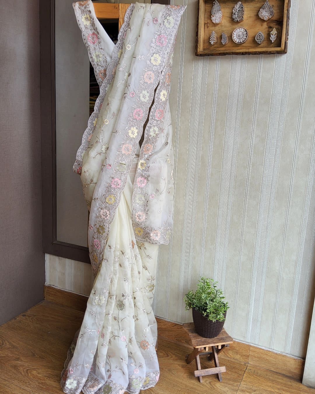 Embrace yourself with this pure white Orra around you with all the purity here's White beauty of 6 yards of jimmyChoo fabric delicately crafted with multicolored thread and zaridori embroidery in floral motifs comes with an abstract cutwork heavily embellished border This peice of beauty comes with a pure white silk blouse