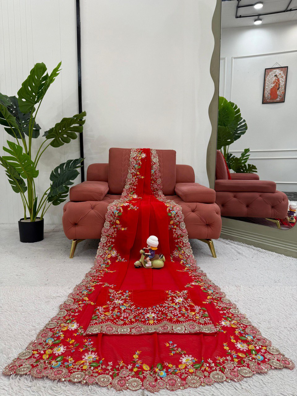 Looking some one for this same colour beautiful Designer Saree on Faux Georgette Febric with Thred & Sequnce work and blouse on also Faux Georgette Febric with Thred & Sequnce work.