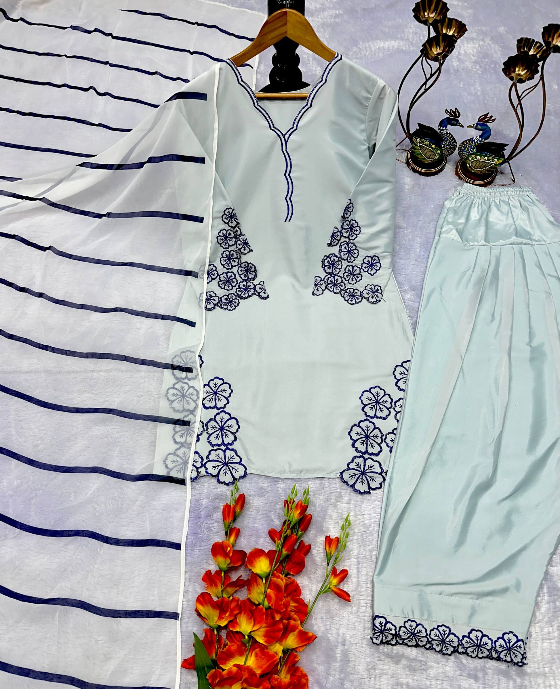 PARTY WEAR TOP AND FARSI SALVAR . WITH FANCY DUPPATA AND EMBROIDERY WORK