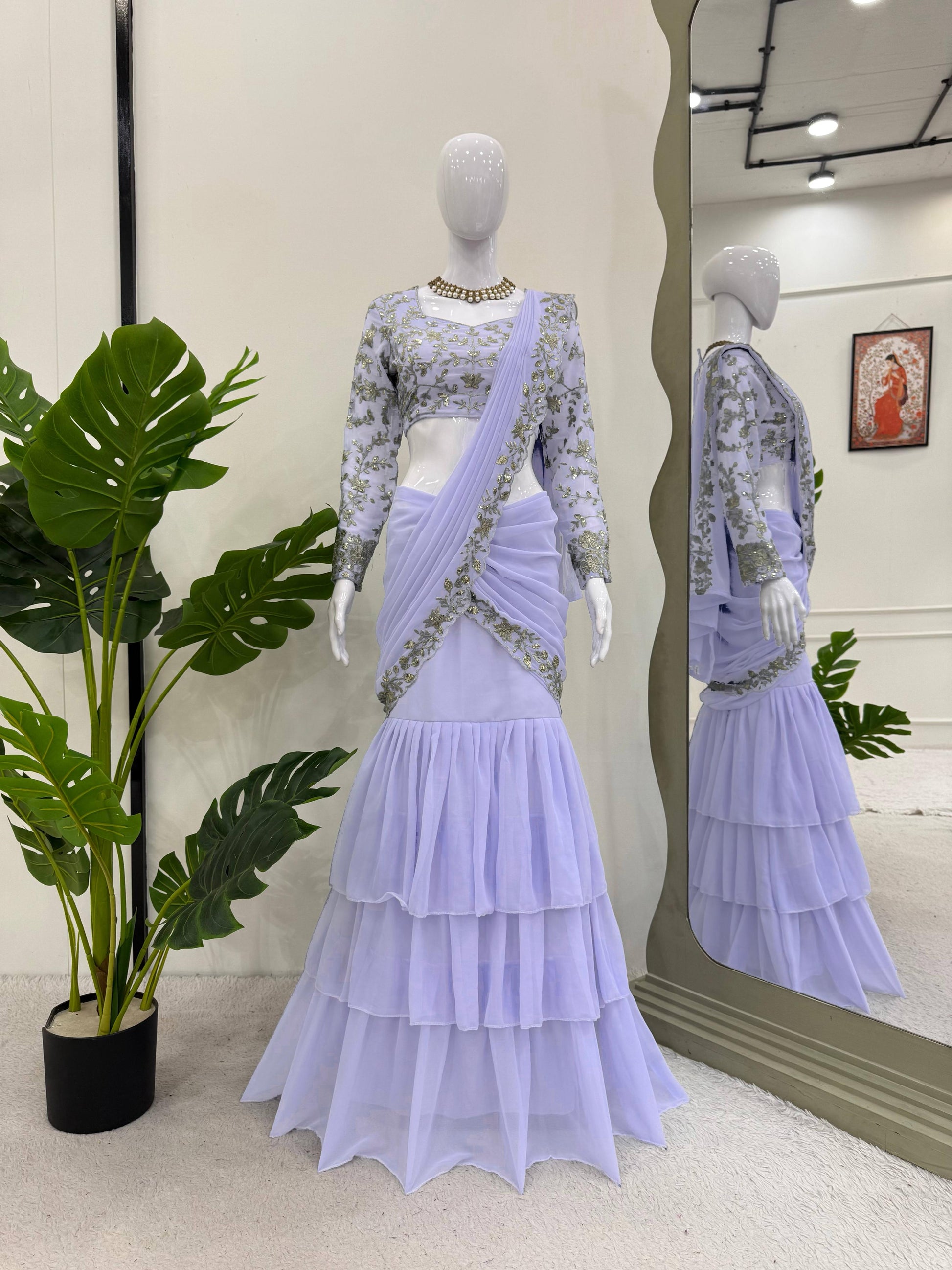 Reday to wear Lehengha saree on Fox Gorgette fabric on thread work with side zip chine