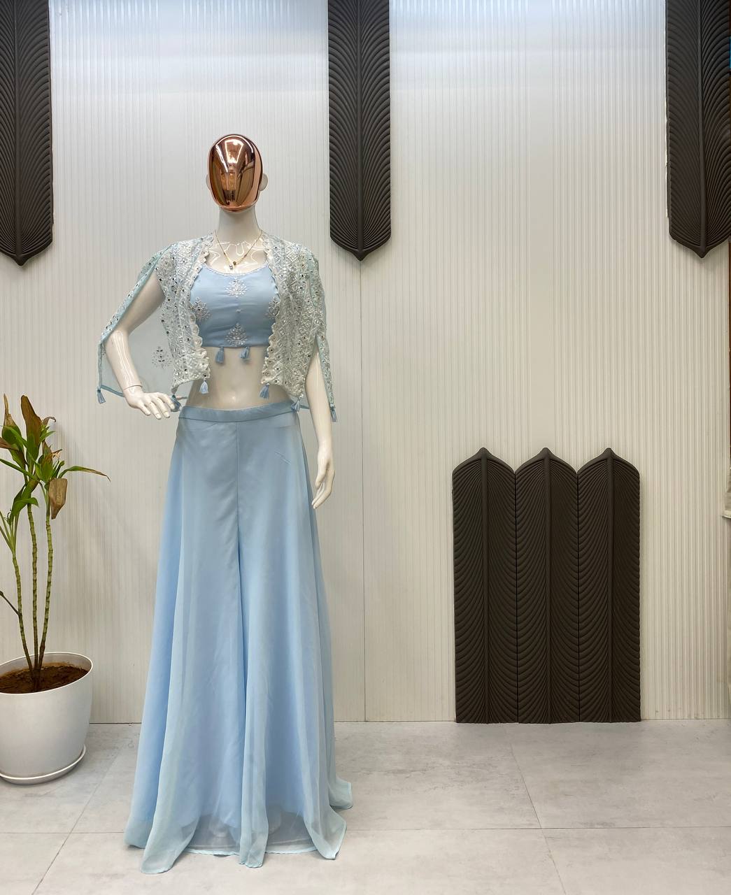 TRENDING PARTY WEAR THREE PIECE BLOUSE,PLAZZO AND SHRUGE WITH SEQUANCE EMBROIDERY REAL MIRROR WORK