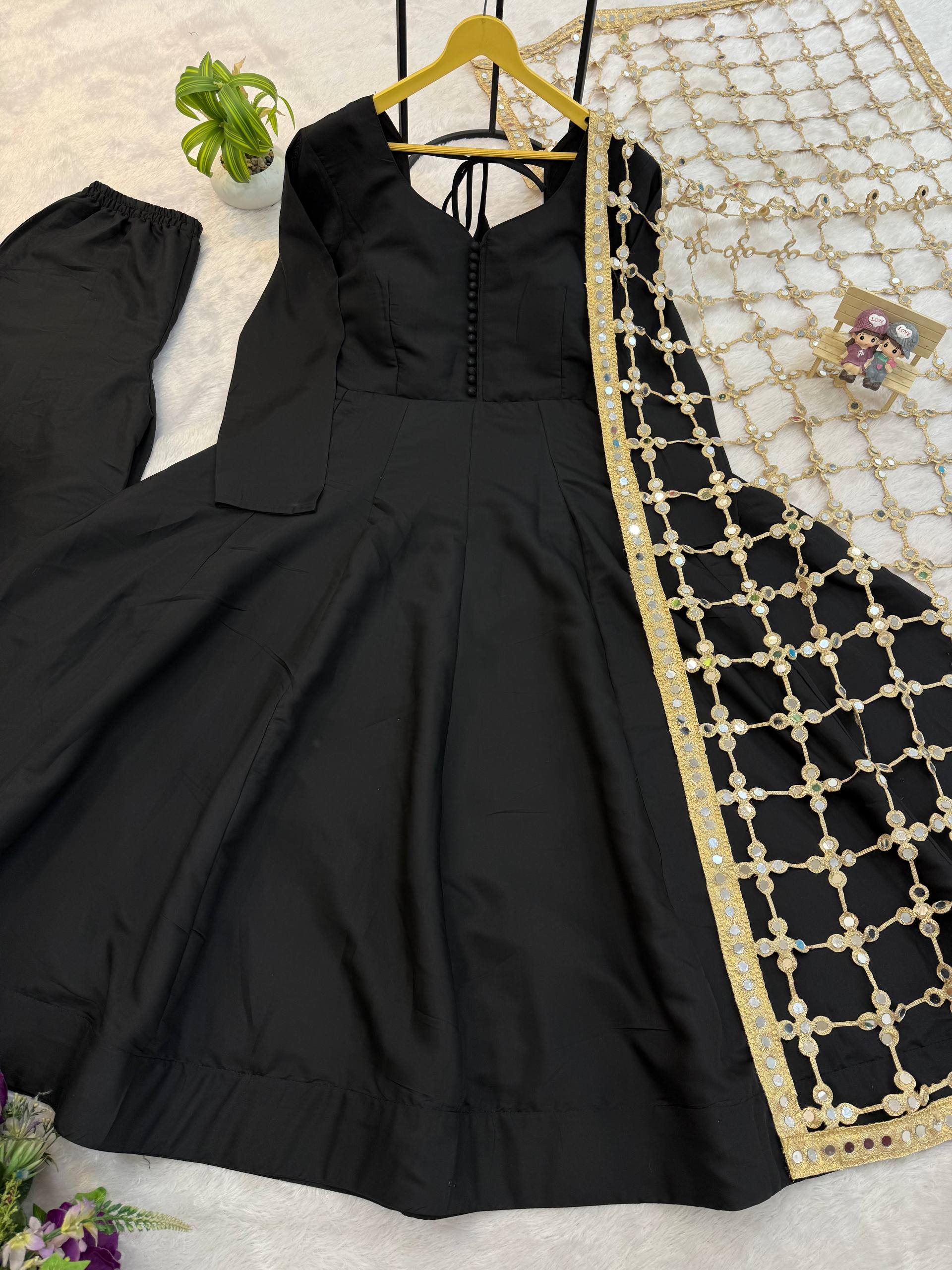 TRENDING ROMAN SILK FABRIC 3 PIECE SET TOP,BOTTOM & DUPATTA WITH EMBROIDERY & REAL MIRROR WORK