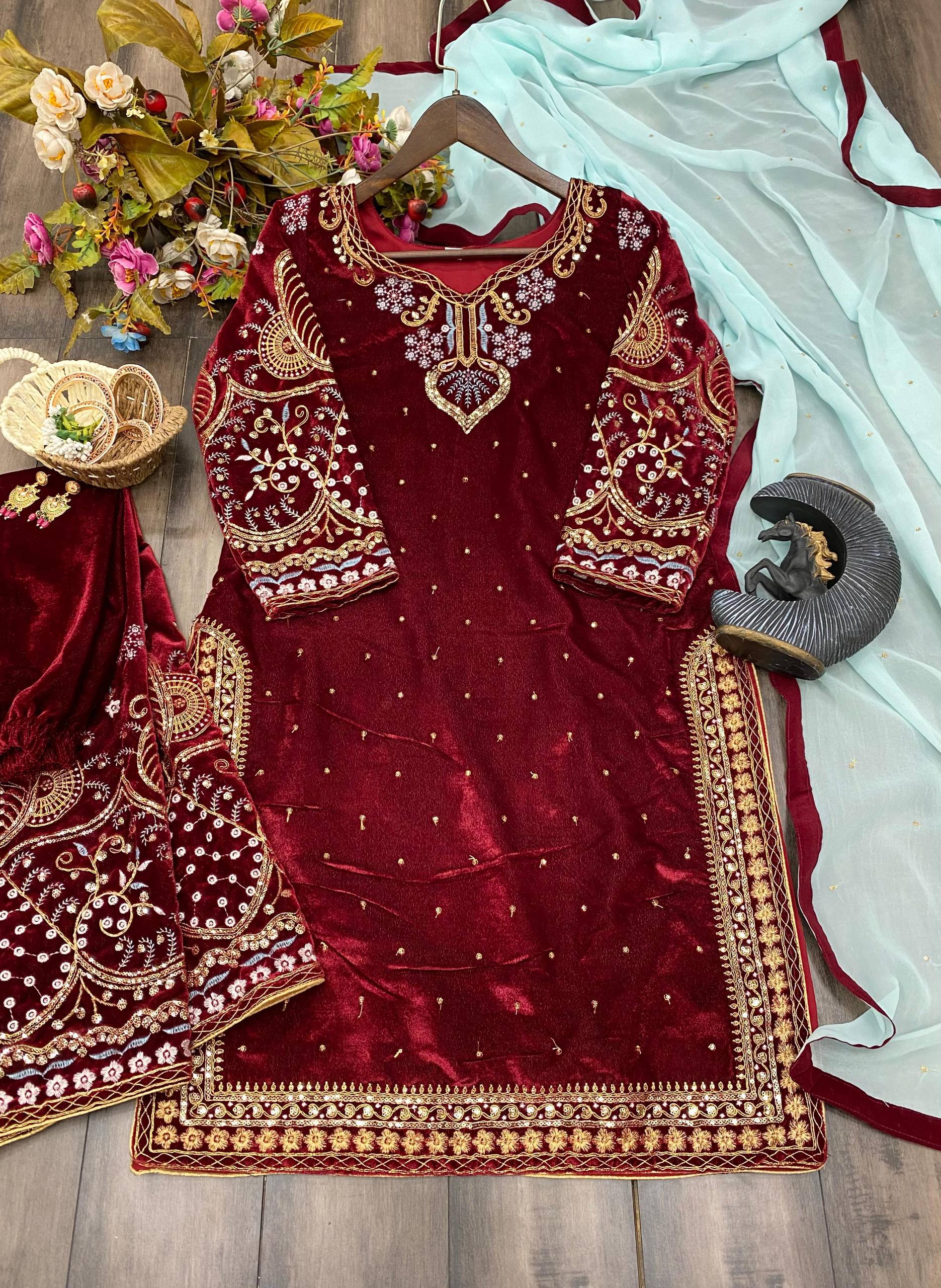 VELVET CORDING SEQUENCE EMBROIDERY WORK SUIT WITH DUPATTA single available wholesale