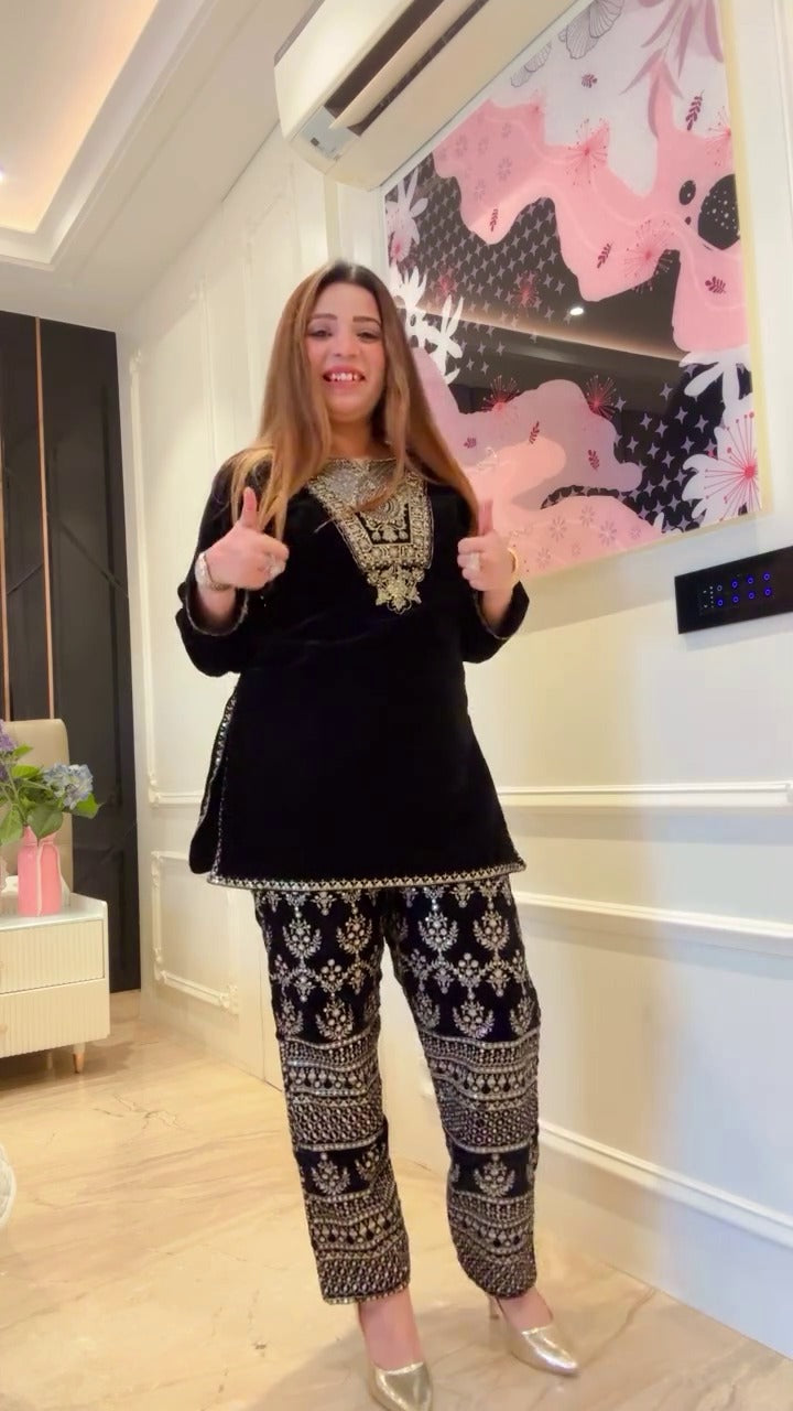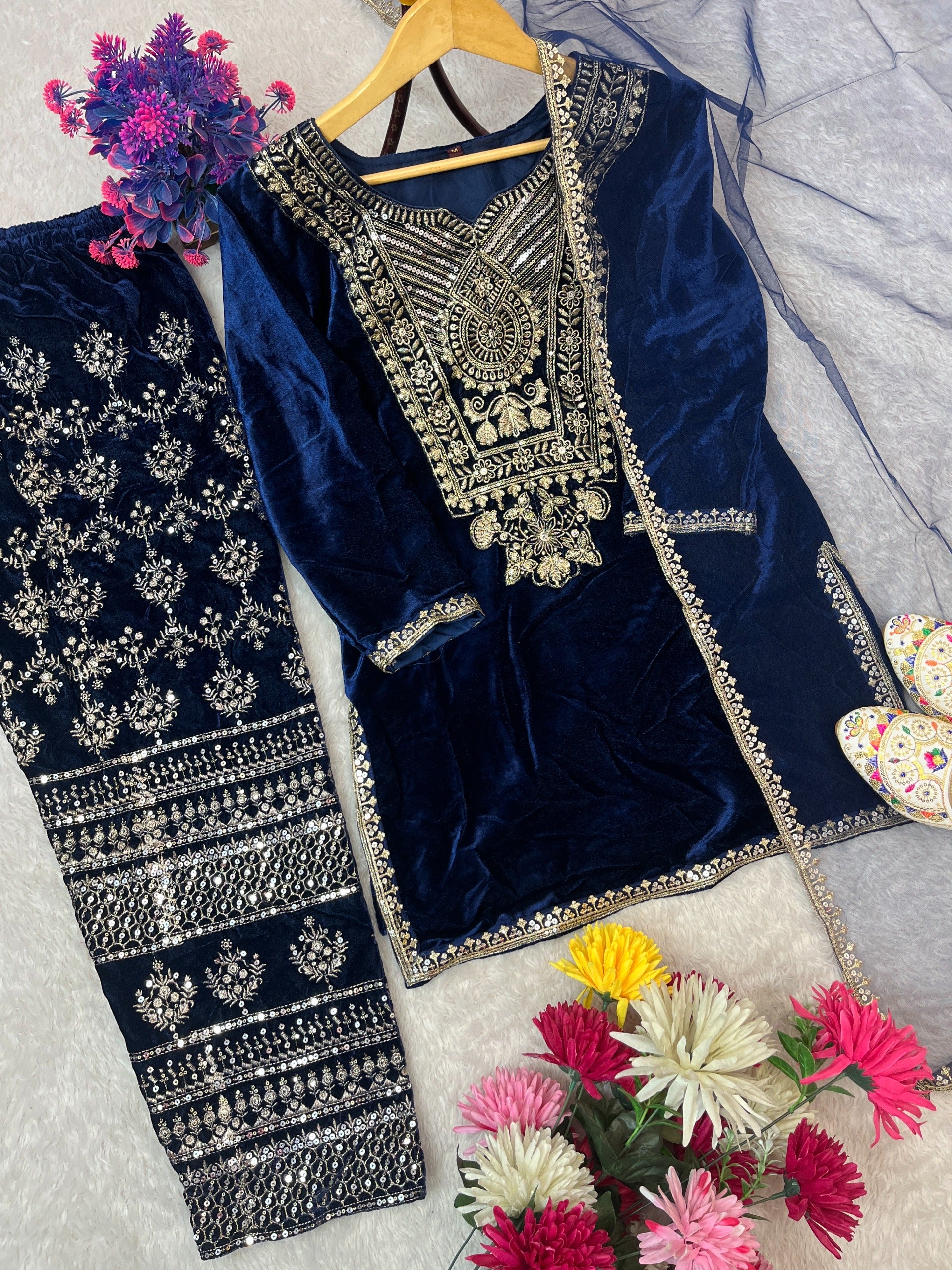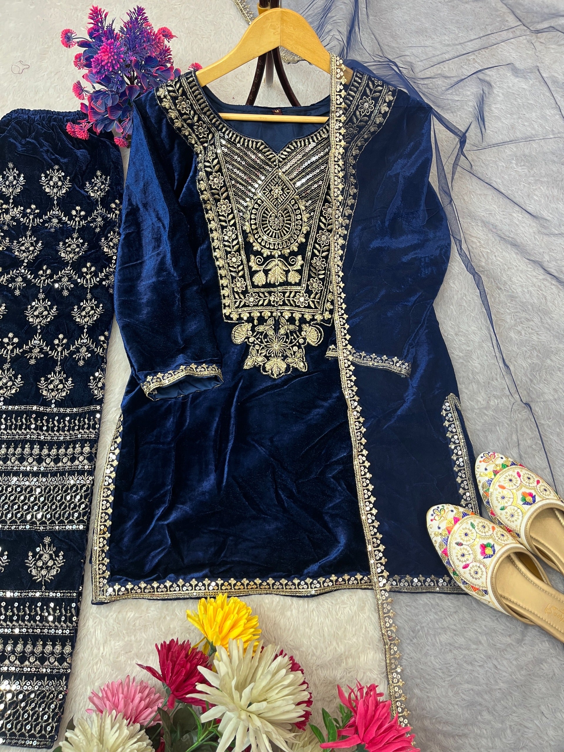 VELVET SEQUENCE EMBROIDERY WORK SUIT PANT WITH DUPATTA single available wholesale